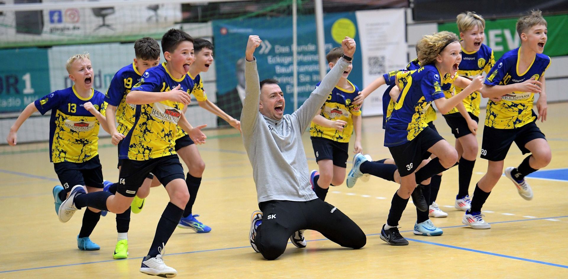 Im ersten Spiel der Veranstaltung dann ein faustdickes Ausrufezeichen, denn Ausrichter Neumühle gleicht durch Tore von Theo Jefremow und Jannik Howe zweimal gegen die Kogge vom FC Hansa Rostock aus und holt mit viel Energie und Leidenschaft einen Punkt. Die Halle explodiert förmlich beim Ausgleich wenige Sekunden vor Spielende. So erlebten die Schweriner Spieler in dieser ersten Partie Momente, die keiner der Jungs so schnell vergessen werden.