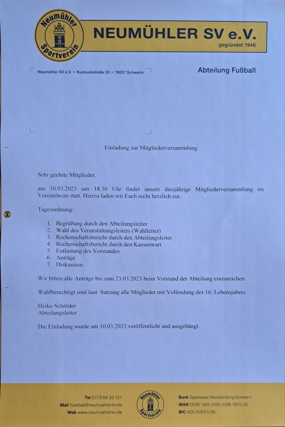 hiermit laden wir euch rechtherzlich zur Mitgliederversammlung am 30.03.2023 // 18:30 Uhr // Vereinsheim ein.