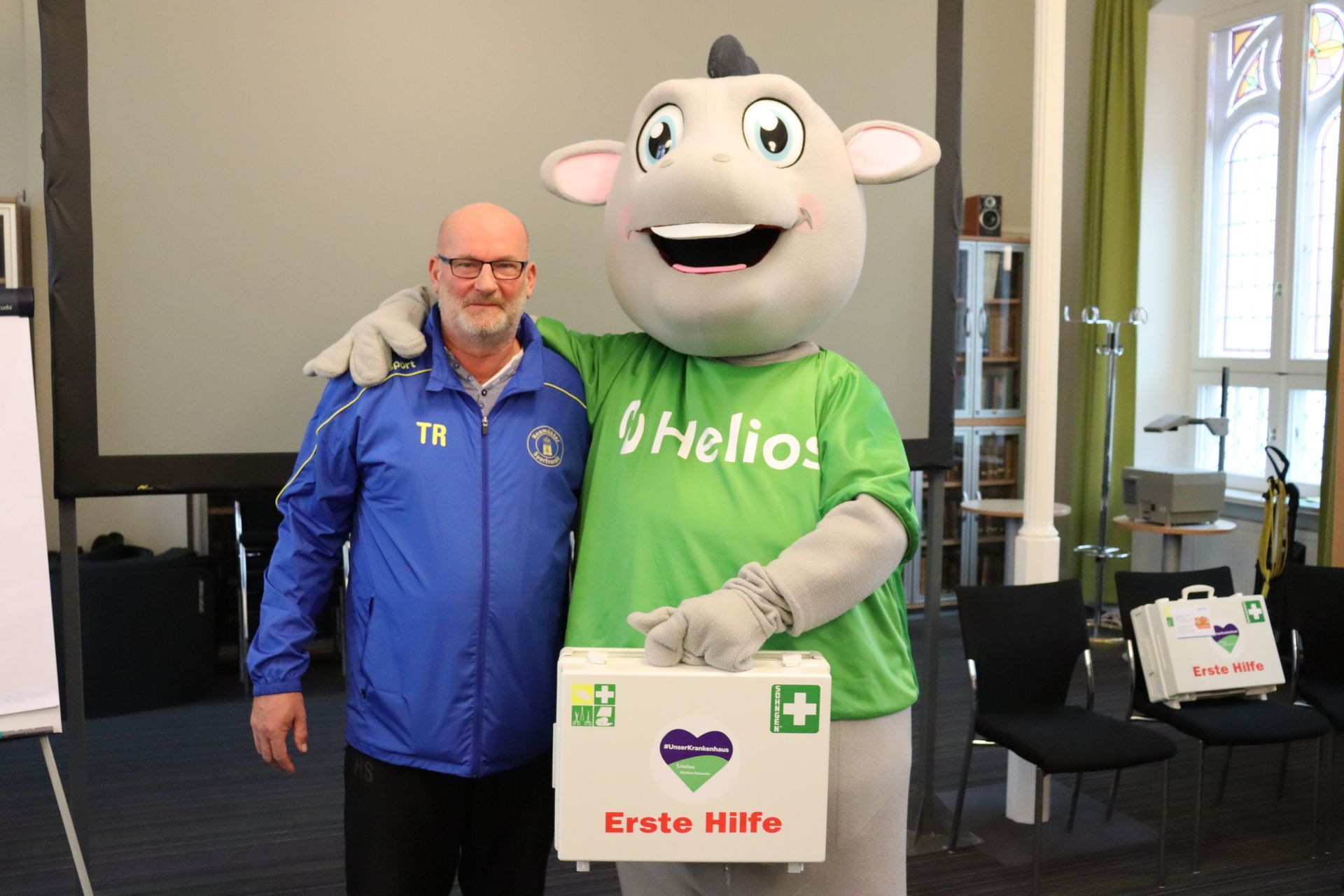Am 15.11.23 war es endlich soweit, Helios das Maskotchen der Helios Kliniken GmbH übergab an Heiko Schröder einen vollgefüllten nagelneuen Sanikoffer an den NSV.